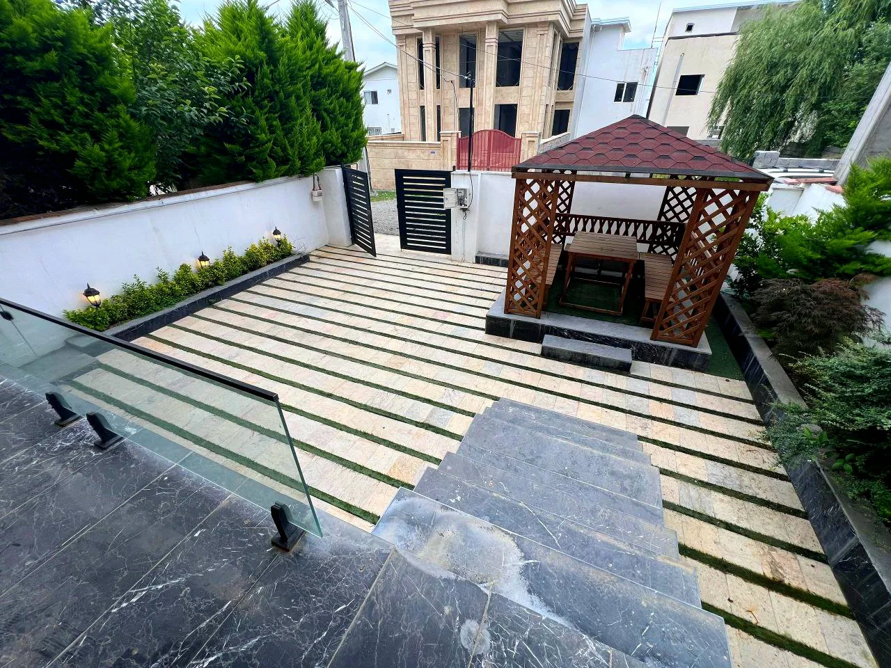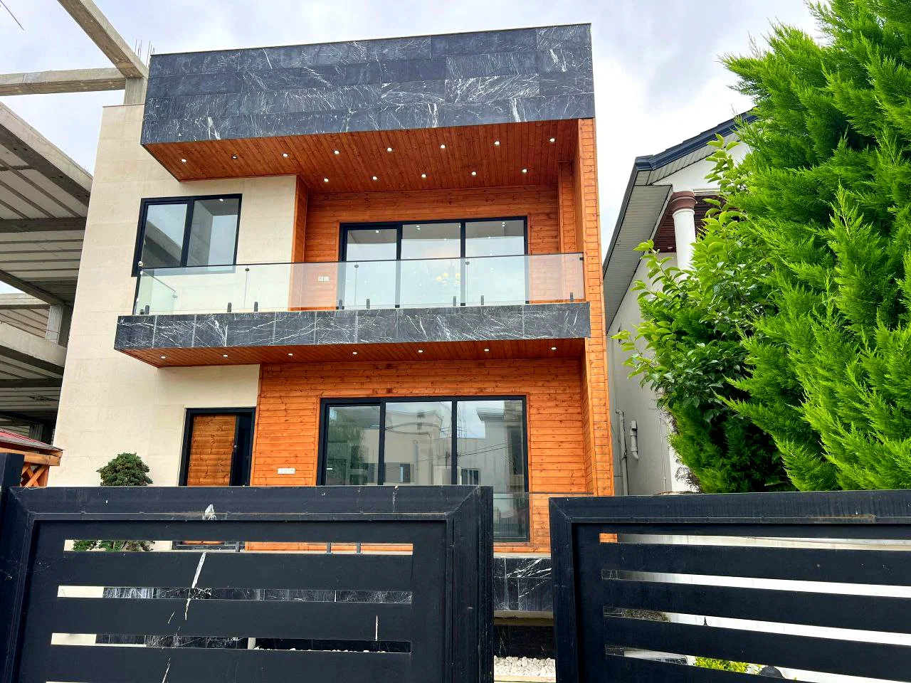 ویلا تریبلکس مدرن 230 متر زمین، 350 متر بنا چهار خواب، سه خواب مستر انشعابات اختصاصی سند و مدارک تکمیل کابینت و کمد دیواری گاز صفحه ای و هود جکوزی و سونا خشک آلاچیق و باربیکیو تراس قابل چیدمان حیاط سازی دلنشین و مرتب شاه نشین با نیم ست آشپزخانه و روف با ویو زیبای جنگل