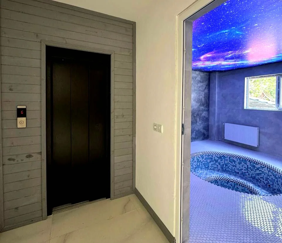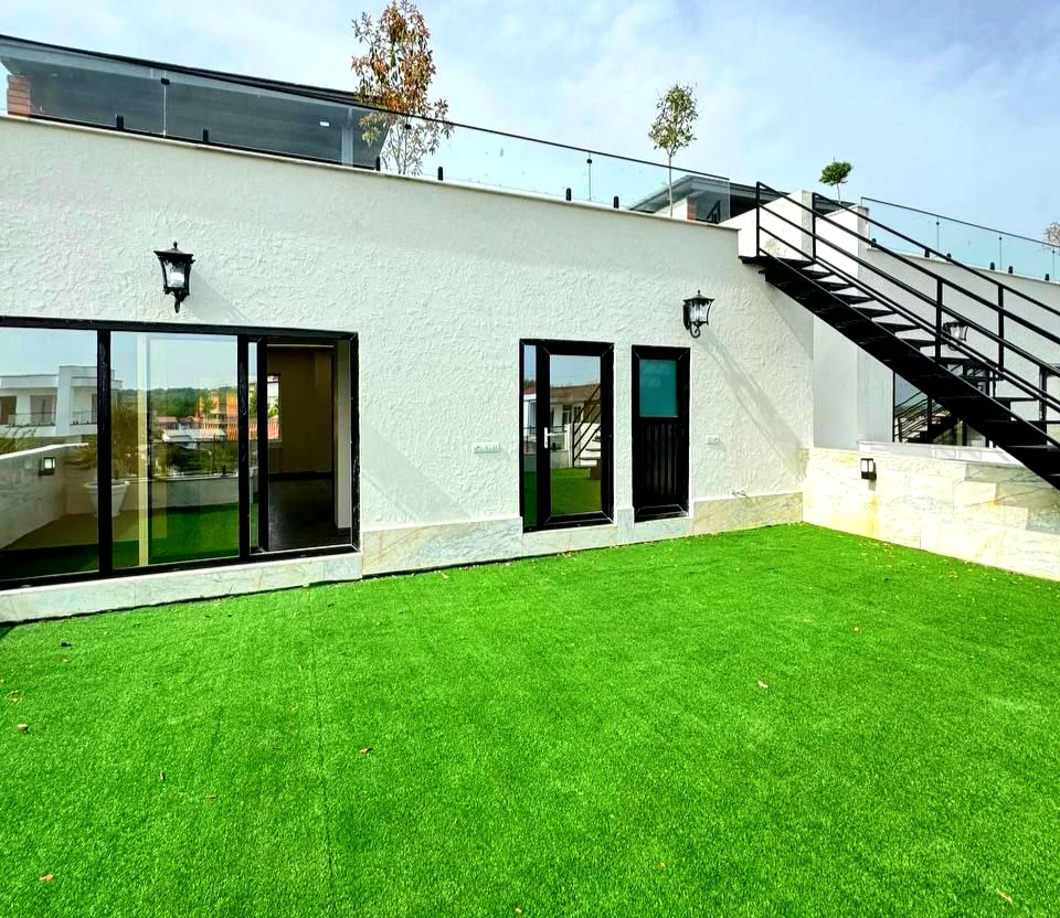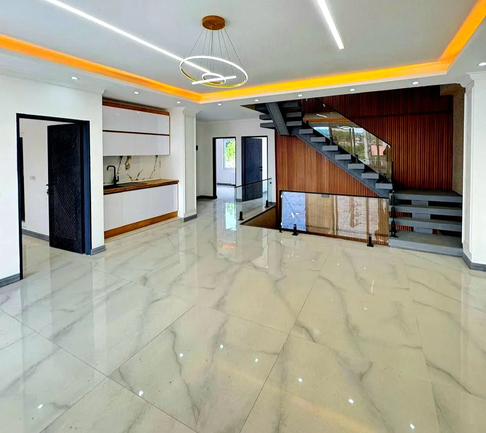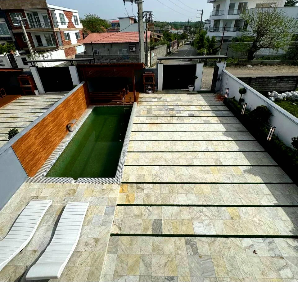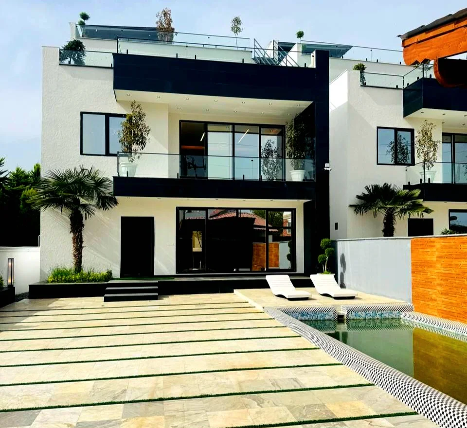 ویلا تریبلکس مدرن 350 متر زمین، 450 متر بنا چهار خواب، سه خواب مستر سند تک برگ و پایانکار انشعابات اختصاصی استخر روباز و جکوزی داخلی آسانسور تراس کاربردی آلاچیق و باربیکیو حیاط سازی مرتب دیوار بلند و بدون مشرف دبل روف گاردن با ویو ابدی کوه و جنگل